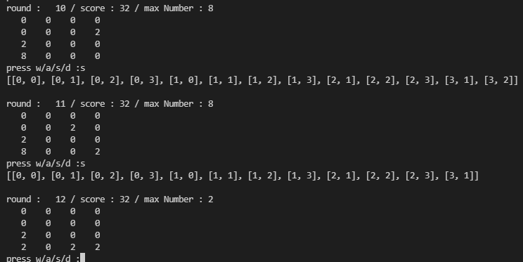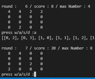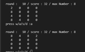 - a를 눌러 왼쪽으로 이동시켰는데 합쳐진 4는 사라지고, 그 자리에 2가 랜덤으로 생겨난 상황.