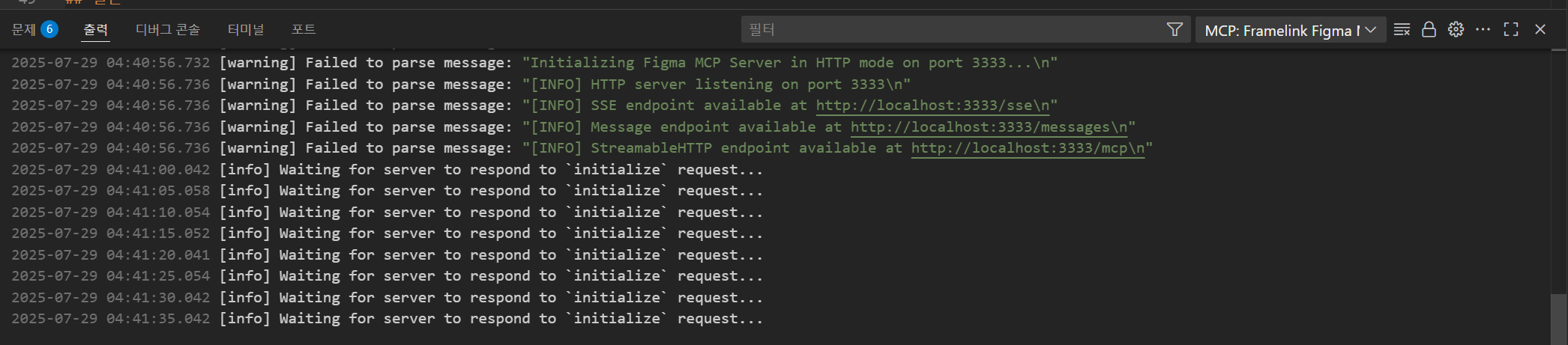 VS Code 출력 창에서 MCP 서버 상태를 확인할 수 있습니다: